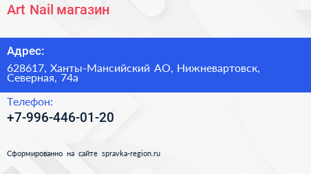 Art Nail, магазин по адресу 628617, Ханты-Мансийский АО, Нижневартовск, Северная, 74а в дальнейшем Организация, размещена в следующих категориях: