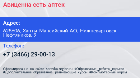 Авиценна, сеть аптек по адресу 628606, Ханты-Мансийский АО, Нижневартовск, Нефтяников, 9 в дальнейшем Организация, размещена в следующих категориях: