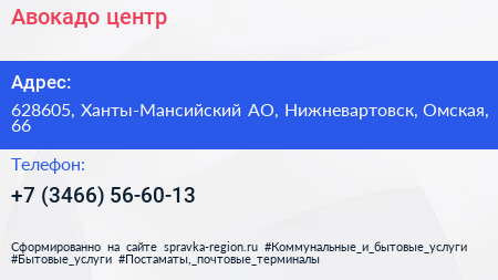 Авокадо, центр по адресу 628605, Ханты-Мансийский АО, Нижневартовск, Омская, 66 в дальнейшем Организация, размещена в следующих категориях: