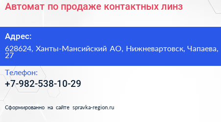 Автомат по продаже контактных линз по адресу 628624, Ханты-Мансийский АО, Нижневартовск, Чапаева, 27 в дальнейшем Организация, размещена в следующих категориях: