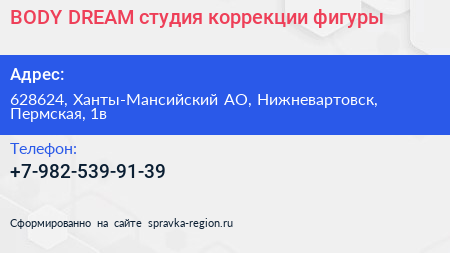 BODY DREAM, студия коррекции фигуры по адресу 628624, Ханты-Мансийский АО, Нижневартовск, Пермская, 1в в дальнейшем Организация, размещена в следующих категориях:
