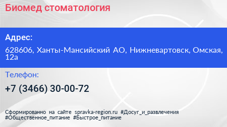 Биомед, стоматология по адресу 628606, Ханты-Мансийский АО, Нижневартовск, Омская, 12а в дальнейшем Организация, размещена в следующих категориях: