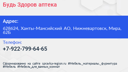 Будь Здоров, аптека по адресу 628624, Ханты-Мансийский АО, Нижневартовск, Мира, 62Б в дальнейшем Организация, размещена в следующих категориях: