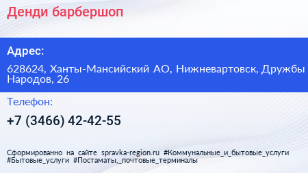 Денди, барбершоп по адресу 628624, Ханты-Мансийский АО, Нижневартовск, Дружбы Народов, 26 в дальнейшем Организация, размещена в следующих категориях: