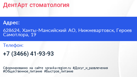 ДентАрт, стоматология по адресу 628624, Ханты-Мансийский АО, Нижневартовск, Героев Самотлора, 19 в дальнейшем Организация, размещена в следующих категориях: