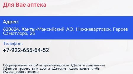 Для Вас, аптека по адресу 628624, Ханты-Мансийский АО, Нижневартовск, Героев Самотлора, 25 в дальнейшем Организация, размещена в следующих категориях: