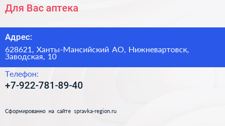 Для Вас, аптека по адресу 628621, Ханты-Мансийский АО, Нижневартовск, Заводская, 10 в дальнейшем Организация, размещена в следующих категориях:
