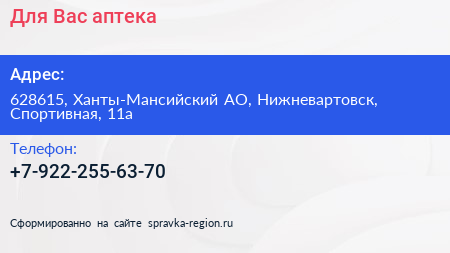 Для Вас, аптека по адресу 628615, Ханты-Мансийский АО, Нижневартовск, Спортивная, 11а в дальнейшем Организация, размещена в следующих категориях: