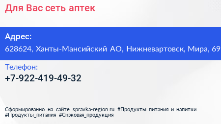 Для Вас, сеть аптек по адресу 628624, Ханты-Мансийский АО, Нижневартовск, Мира, 69 в дальнейшем Организация, размещена в следующих категориях: