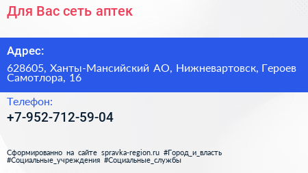 Для Вас, сеть аптек по адресу 628605, Ханты-Мансийский АО, Нижневартовск, Героев Самотлора, 16 в дальнейшем Организация, размещена в следующих категориях: