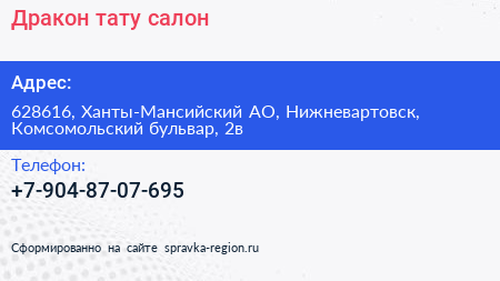Дракон, тату-салон по адресу 628616, Ханты-Мансийский АО, Нижневартовск, Комсомольский бульвар, 2в в дальнейшем Организация, размещена в следующих категориях: