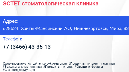 ЭСТЕТ, стоматологическая клиника по адресу 628624, Ханты-Мансийский АО, Нижневартовск, Мира, 83 в дальнейшем Организация, размещена в следующих категориях: