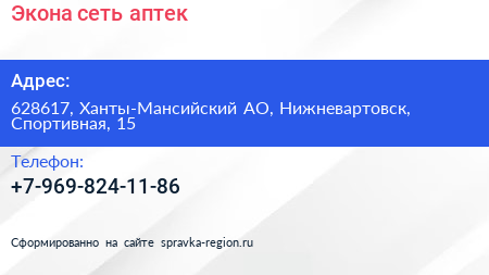 Экона, сеть аптек по адресу 628617, Ханты-Мансийский АО, Нижневартовск, Спортивная, 15 в дальнейшем Организация, размещена в следующих категориях: