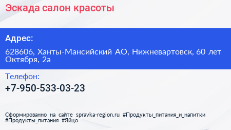 Эскада, салон красоты по адресу 628606, Ханты-Мансийский АО, Нижневартовск, 60 лет Октября, 2а в дальнейшем Организация, размещена в следующих категориях: