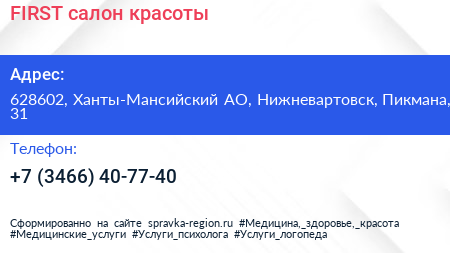 FIRST, салон красоты по адресу 628602, Ханты-Мансийский АО, Нижневартовск, Пикмана, 31 в дальнейшем Организация, размещена в следующих категориях: