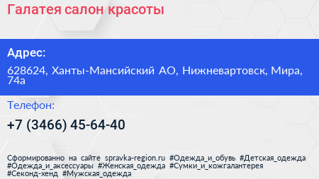 Галатея, салон красоты по адресу 628624, Ханты-Мансийский АО, Нижневартовск, Мира, 74а в дальнейшем Организация, размещена в следующих категориях: