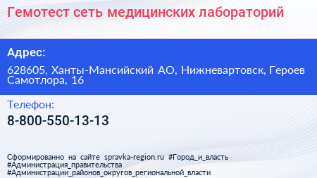 Гемотест, сеть медицинских лабораторий по адресу 628605, Ханты-Мансийский АО, Нижневартовск, Героев Самотлора, 16 в дальнейшем Организация, размещена в следующих категориях: