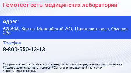 Гемотест, сеть медицинских лабораторий по адресу 628606, Ханты-Мансийский АО, Нижневартовск, Омская, 28а в дальнейшем Организация, размещена в следующих категориях: