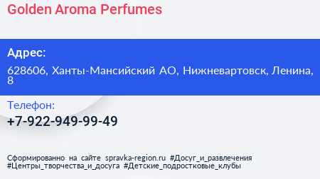 Golden Aroma Perfumes по адресу 628606, Ханты-Мансийский АО, Нижневартовск, Ленина, 8 в дальнейшем Организация, размещена в следующих категориях: