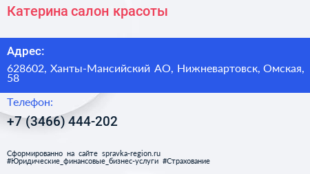 Катерина, салон красоты по адресу 628602, Ханты-Мансийский АО, Нижневартовск, Омская, 58 в дальнейшем Организация, размещена в следующих категориях: