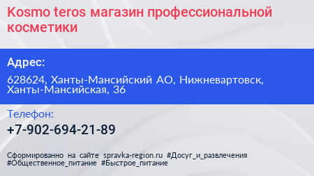 Kosmo teros, магазин профессиональной косметики по адресу 628624, Ханты-Мансийский АО, Нижневартовск, Ханты-Мансийская, 36 в дальнейшем Организация, размещена в следующих категориях: