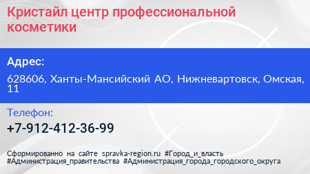 Кристайл, центр профессиональной косметики по адресу 628606, Ханты-Мансийский АО, Нижневартовск, Омская, 11 в дальнейшем Организация, размещена в следующих категориях: