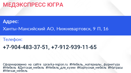 МЕДЭКСПРЕСС-ЮГРА по адресу Ханты-Мансийский АО, Нижневартовск, 9 П, 16 в дальнейшем Организация, размещена в следующих категориях: