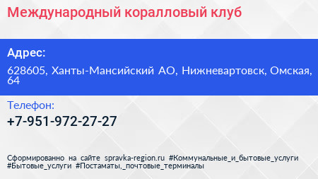 Международный коралловый клуб по адресу 628605, Ханты-Мансийский АО, Нижневартовск, Омская, 64 в дальнейшем Организация, размещена в следующих категориях: