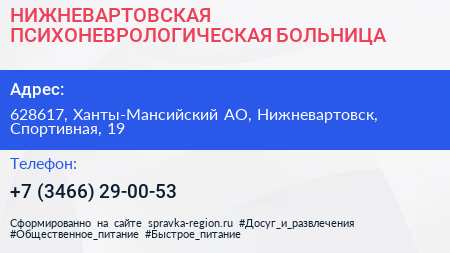 НИЖНЕВАРТОВСКАЯ ПСИХОНЕВРОЛОГИЧЕСКАЯ БОЛЬНИЦА по адресу 628617, Ханты-Мансийский АО, Нижневартовск, Спортивная, 19 в дальнейшем Организация, размещена в следующих категориях: