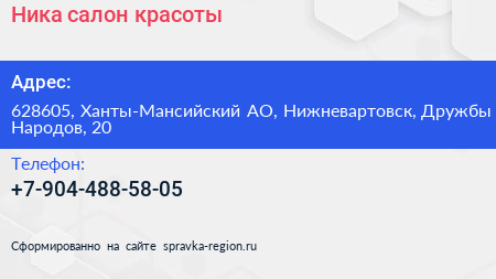 Ника, салон красоты по адресу 628605, Ханты-Мансийский АО, Нижневартовск, Дружбы Народов, 20 в дальнейшем Организация, размещена в следующих категориях: