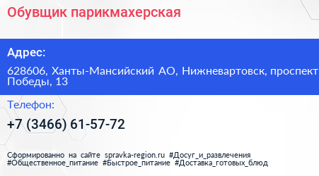 Обувщик, парикмахерская по адресу 628606, Ханты-Мансийский АО, Нижневартовск, проспект Победы, 13 в дальнейшем Организация, размещена в следующих категориях: