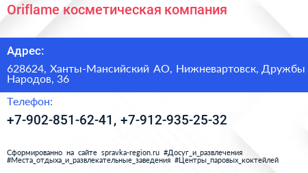Oriflame, косметическая компания по адресу 628624, Ханты-Мансийский АО, Нижневартовск, Дружбы Народов, 36 в дальнейшем Организация, размещена в следующих категориях: