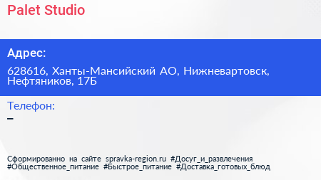 Palet Studio по адресу 628616, Ханты-Мансийский АО, Нижневартовск, Нефтяников, 17Б в дальнейшем Организация, размещена в следующих категориях: