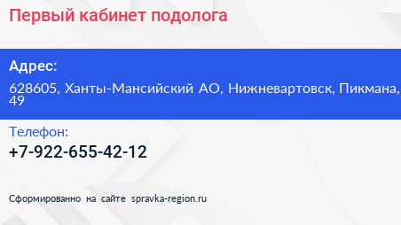 Первый кабинет подолога по адресу 628605, Ханты-Мансийский АО, Нижневартовск, Пикмана, 49 в дальнейшем Организация, размещена в следующих категориях:
