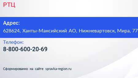 РТЦ по адресу 628624, Ханты-Мансийский АО, Нижневартовск, Мира, 77 в дальнейшем Организация, размещена в следующих категориях: