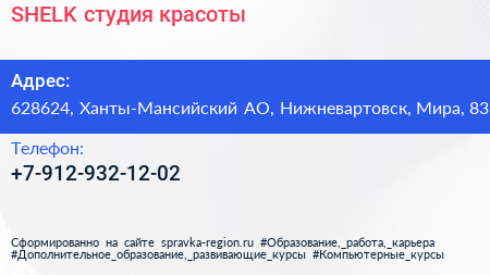 SHELK, студия красоты по адресу 628624, Ханты-Мансийский АО, Нижневартовск, Мира, 83 в дальнейшем Организация, размещена в следующих категориях: