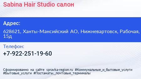 Sabina Hair Studio, салон по адресу 628621, Ханты-Мансийский АО, Нижневартовск, Рабочая, 15д в дальнейшем Организация, размещена в следующих категориях: