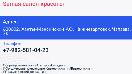 Samaя, салон красоты по адресу 628602, Ханты-Мансийский АО, Нижневартовск, Чапаева, 7в в дальнейшем Организация, размещена в следующих категориях: