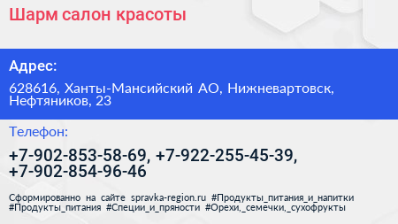 Шарм, салон красоты по адресу 628616, Ханты-Мансийский АО, Нижневартовск, Нефтяников, 23 в дальнейшем Организация, размещена в следующих категориях: