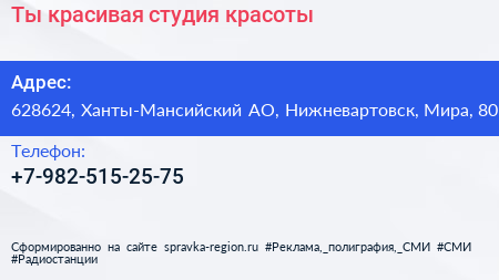 Ты красивая!, студия красоты по адресу 628624, Ханты-Мансийский АО, Нижневартовск, Мира, 80 в дальнейшем Организация, размещена в следующих категориях: