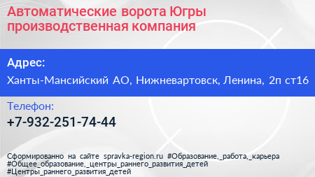 Автоматические ворота Югры, производственная компания по адресу Ханты-Мансийский АО, Нижневартовск, Ленина, 2п ст16 в дальнейшем Организация, размещена в следующих категориях: