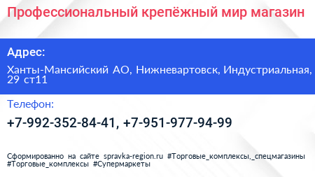 Профессиональный крепёжный мир, магазин по адресу Ханты-Мансийский АО, Нижневартовск, Индустриальная, 29 ст11 в дальнейшем Организация, размещена в следующих категориях: