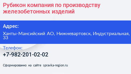 Рубикон, компания по производству железобетонных изделий по адресу Ханты-Мансийский АО, Нижневартовск, Индустриальная, 33 в дальнейшем Организация, размещена в следующих категориях: