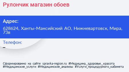Рулончик, магазин обоев по адресу 628624, Ханты-Мансийский АО, Нижневартовск, Мира, 73в в дальнейшем Организация, размещена в следующих категориях: