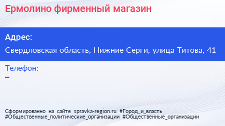 Ермолино, фирменный магазин по адресу Свердловская область, Нижние Серги, улица Титова, 41 в дальнейшем Организация, размещена в следующих категориях: