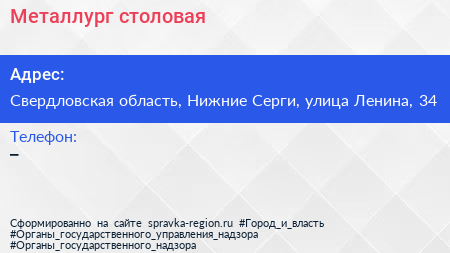 Металлург, столовая по адресу Свердловская область, Нижние Серги, улица Ленина, 34 в дальнейшем Организация, размещена в следующих категориях: