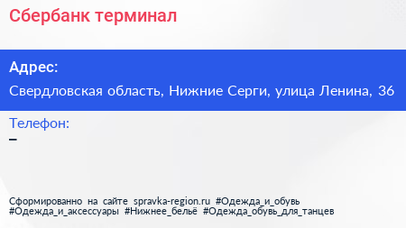 Сбербанк, терминал по адресу Свердловская область, Нижние Серги, улица Ленина, 36 в дальнейшем Организация, размещена в следующих категориях: