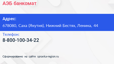 АЭБ, банкомат по адресу 678080, Саха (Якутия), Нижний Бестях, Ленина, 44 в дальнейшем Организация, размещена в следующих категориях: