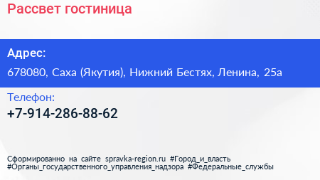 Рассвет, гостиница по адресу 678080, Саха (Якутия), Нижний Бестях, Ленина, 25а в дальнейшем Организация, размещена в следующих категориях: