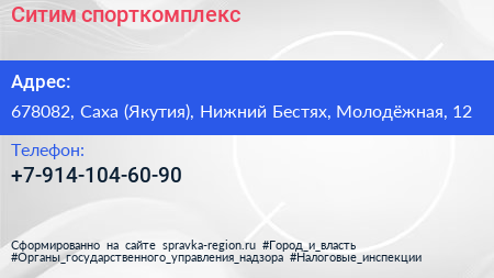 Ситим, спорткомплекс по адресу 678082, Саха (Якутия), Нижний Бестях, Молодёжная, 12 в дальнейшем Организация, размещена в следующих категориях: